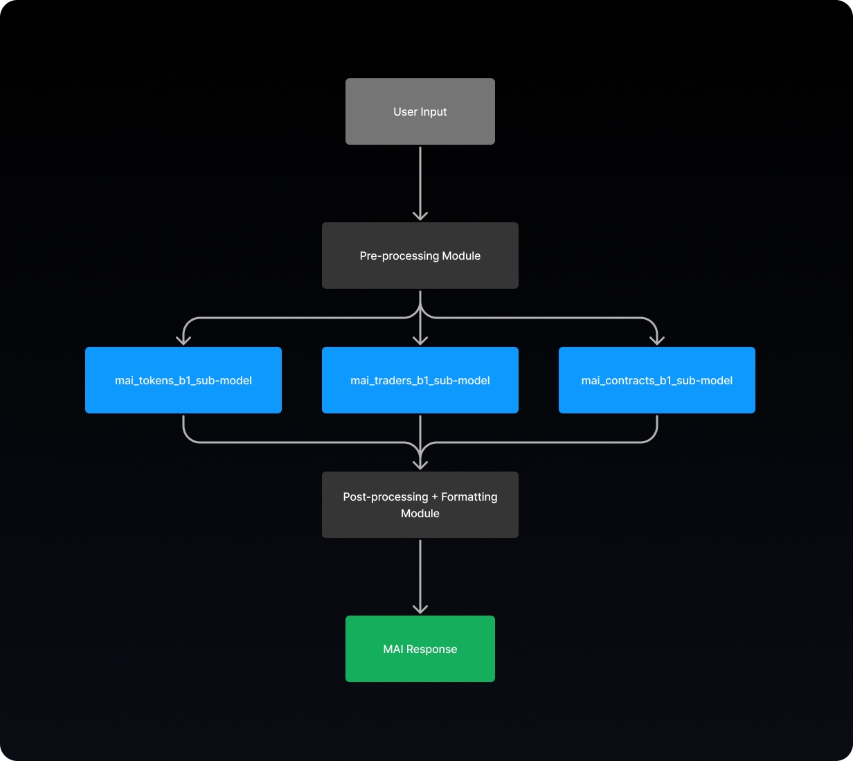 mai_gen_b1 and mai_gen_p1 (coming soon) are powerful LLMs trained specifically on crypto / defi datasets. They also include the ability to obtain live data and relay it to the user conversationally.